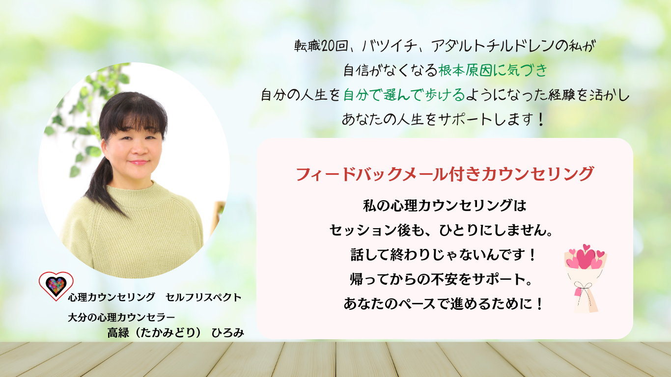 大分の心理カウンセラー/高緑ひろみ(たかみどり ひろみ)です。