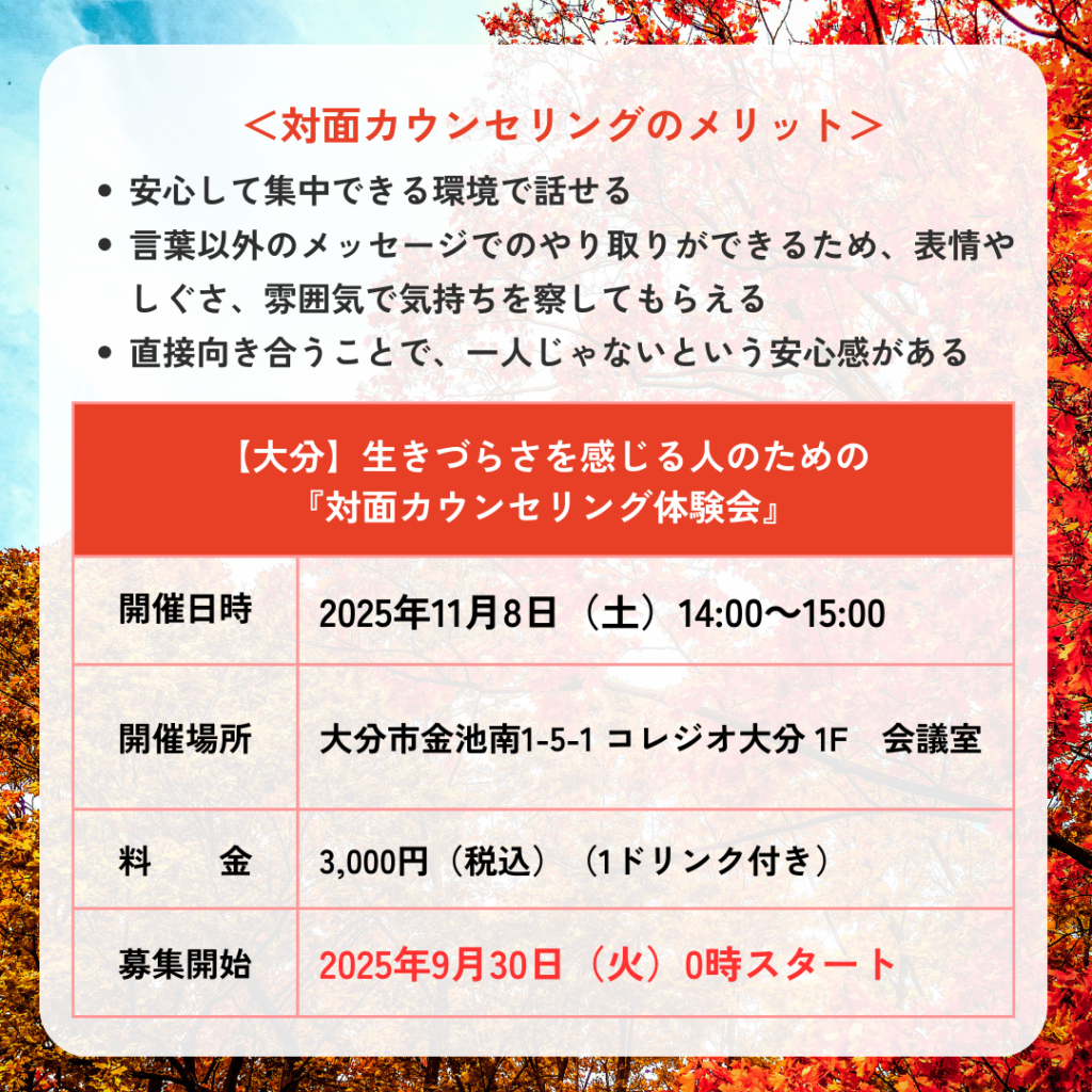 【大分】生きづらさを感じる人のための『対面カウンセリング体験会』を開催✨ 🍀生きづらさを感じるあなたへ 仕事も人間関係も、それなりにこなしてきたけど、心の奥には、ずっと消えない「生きづらさ」がある。 人間関係に疲れた 自分に自信... -