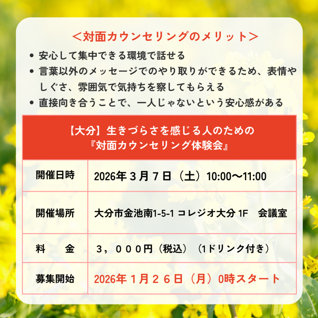 【大分】生きづらさを感じる人のための『対面カウンセリング体験会』を開催✨